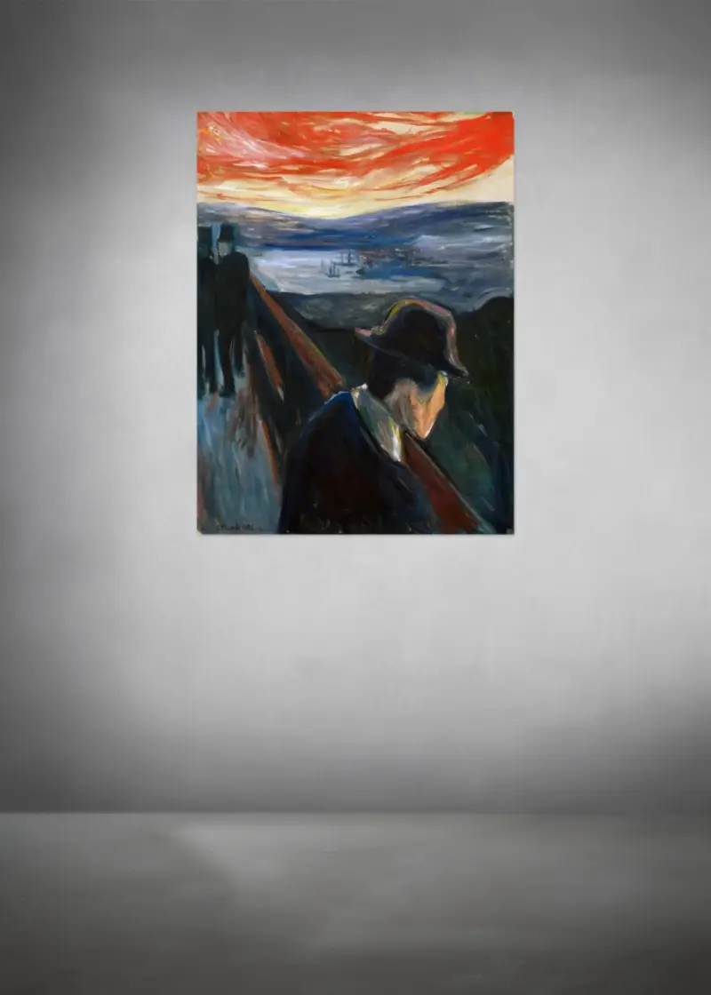 Dieses Ölgemälde zeigt einen einsamen Mann, der an einem Geländer lehnt. Sein Gesicht ist eine ausdruckslose Maske, erstarrt unter einem Himmel aus „geronnenem Blut“. Die schwindelerregende Perspektive der Brücke, die sich durch die dunkle Fjordlandschaft schneidet, schafft eine „erstickende Innenwelt“, in der die Umgebung als direktes Spiegelbild der Psyche fungiert.