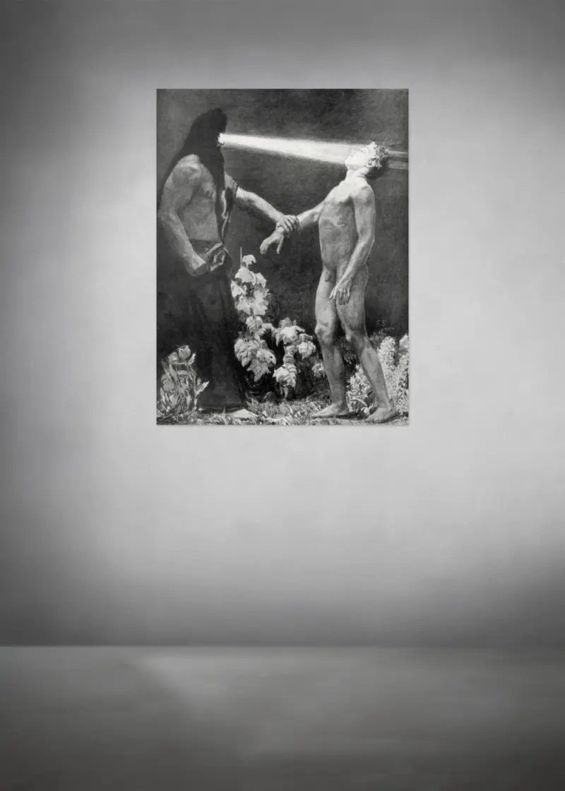 Diese Radierung zeigt eine monumentale, nackte männliche Figur – den Hypnotiseur –, die einen kleineren, in Trance versetzten männlichen Gegenpart dominiert. Der Hintergrund suggeriert eine „verschwommene innere Welt” und dient als abstrakter Raum der Psyche.