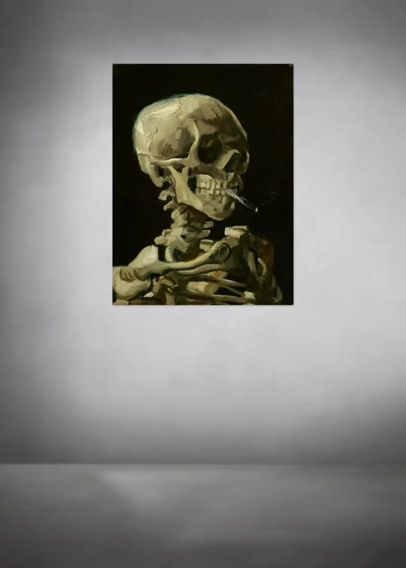The painting’s visual power lies in the morbid absurdity of the scene; it is a memento mori with a rebellious streak. The burning cigarette serves as a tiny, defiant beacon of light against the overwhelming darkness of mortality, bridging the gap between classical 17^(th)-century vanitas paintings and a modern, almost punk-rock nihilism.