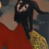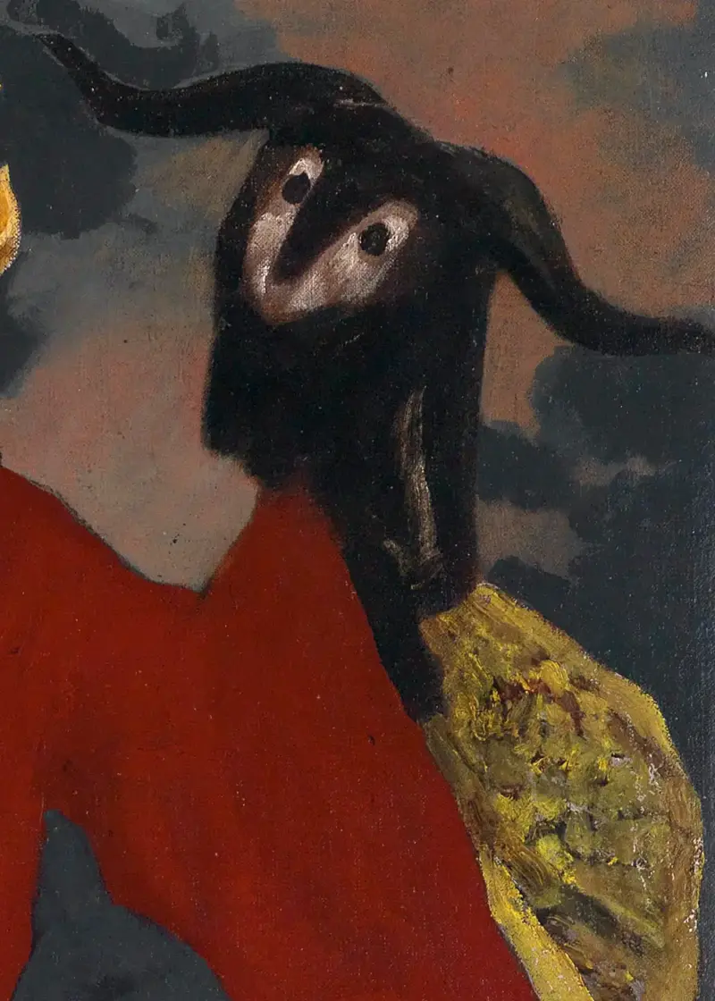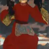 The figure’s piercing, pale gaze and the dramatic contrast between their vivid garment and the sombre, clouded sky heighten the visual tension.