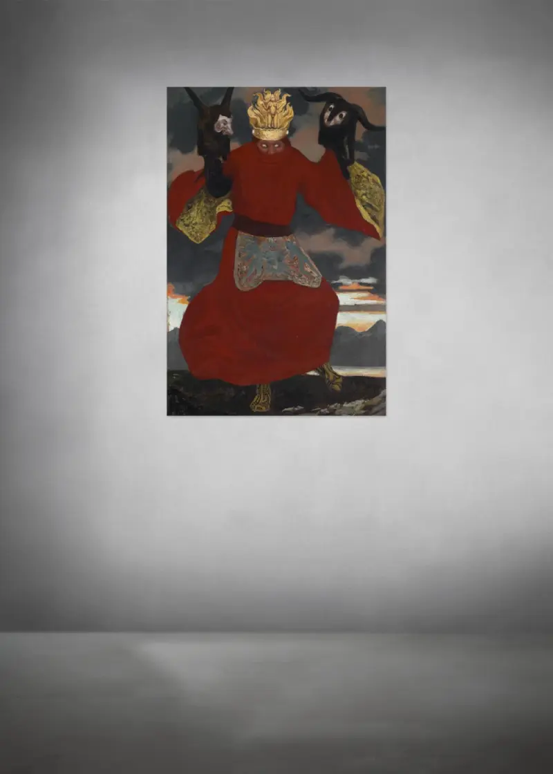 This oil-on-canvas painting depicts a mysterious central figure wearing a vibrant red robe and dominating a dark, mountainous landscape. The figure wears an elaborate golden headdress and holds two dark, horned masks or effigies aloft, creating an intense, ritualistic scene.