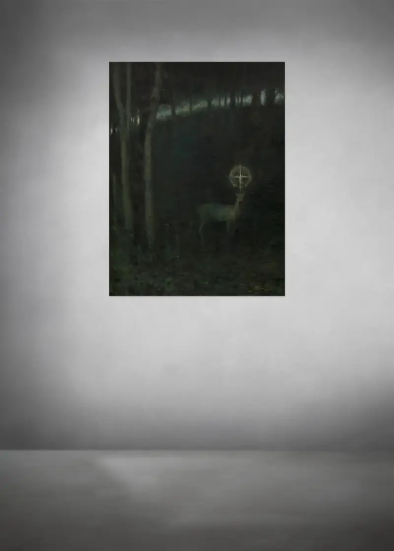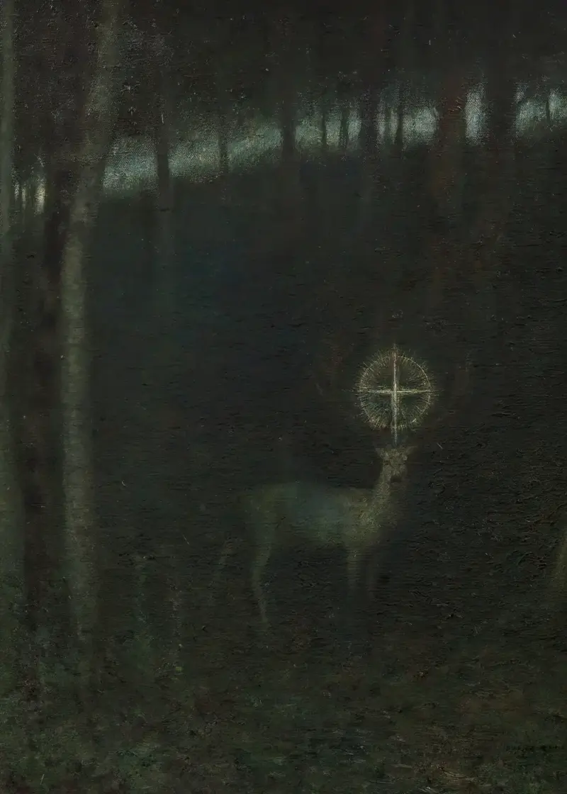 The visual tension lies in the space between the hunter’s halted ambition and the glowing apparition. It symbolises the ‘divine interruption’ of earthly pursuits, blending religious symbolism with pagan naturalism. The stag does not stand as prey, but as an otherworldly messenger, dissolving the boundary between the human and the divine.